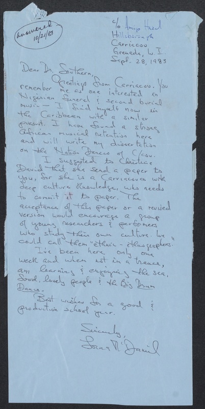 Letter from Lorna McDaniel to Eileen Southern (September 28, 1983)