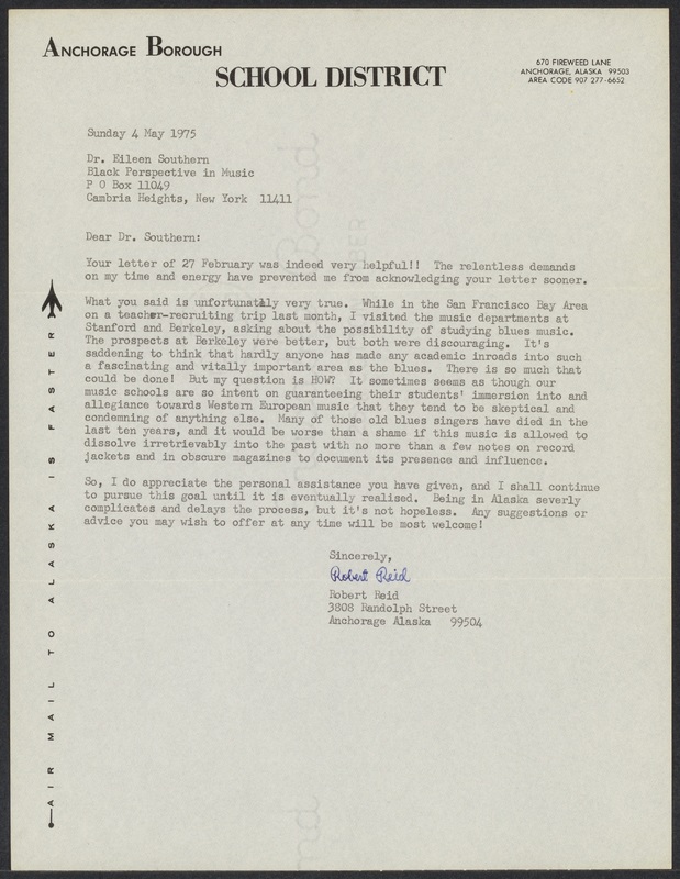 Letter from Robert Reid to Eileen Southern (May 4, 1975)