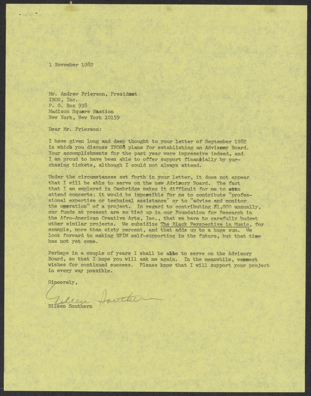 Letter from Eileen Southern to Andrew Frierson (November 1, 1982)