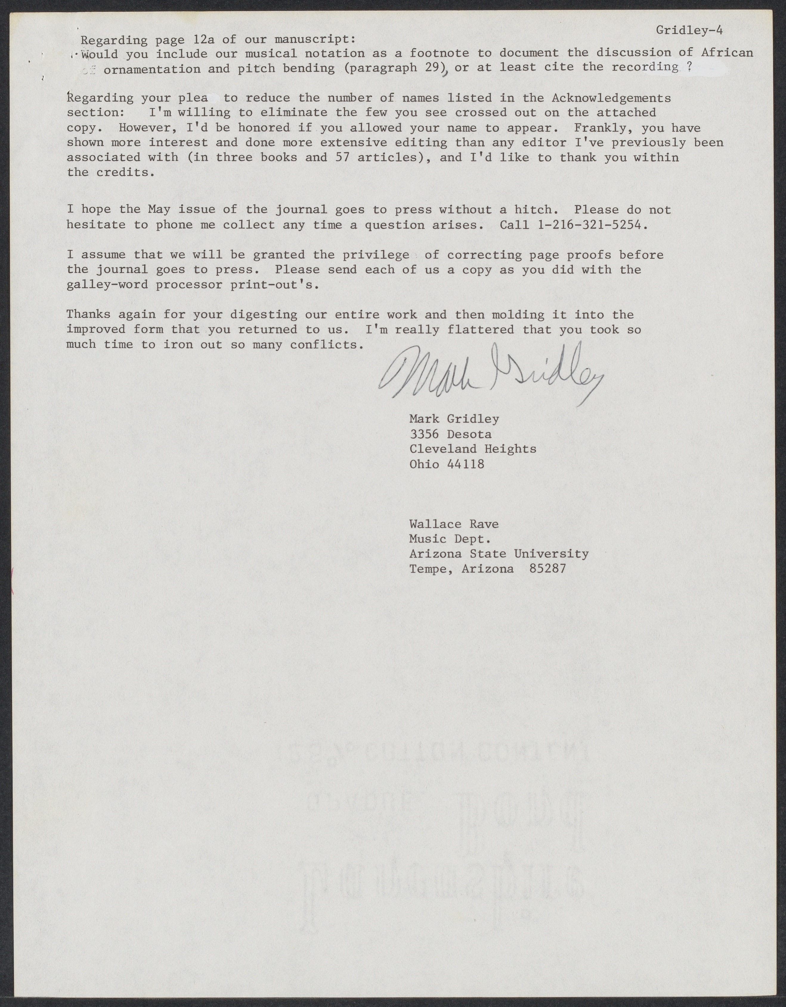 Letter from Mark Gridley to Eileen Southern (April 30, 1984)